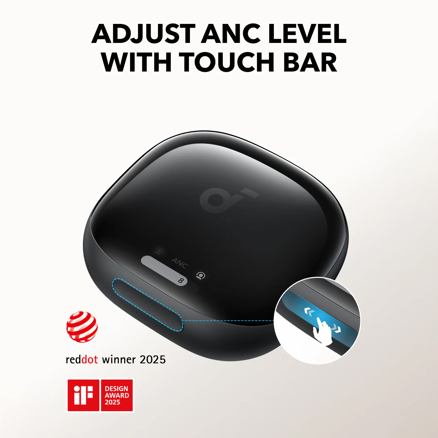 Control your earbuds without even taking out your phone. The sleek charging case of the Anker Soundcore Liberty 4 Pro True Wireless Earbuds includes a responsive touch bar and a display, letting you adjust ANC levels, check battery status, and more—right from the case.